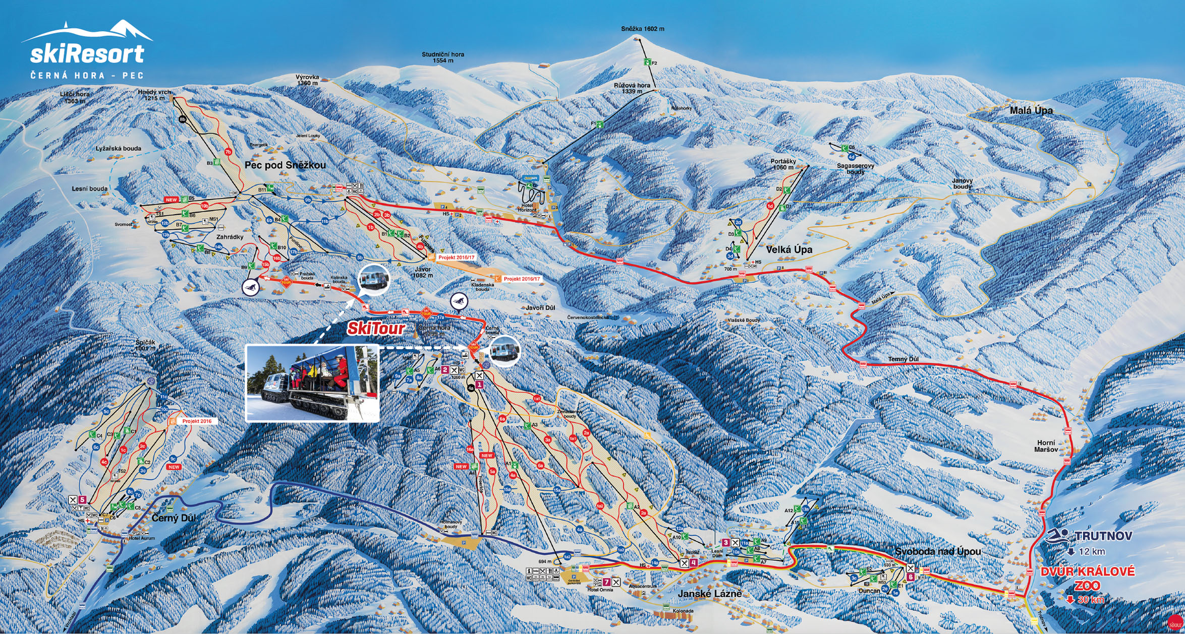 Informacje o ośrodku: Janské Lázně to uzdrowisko oraz ośrodek sportów zimowych. Leży we wschodniej części Karkonoszy, w dolinie Jańskiego potoku pod Černą horą (1299 m n.p.m.). Ilość odwiedzających to uzdrowisko wzrosła przede wszystkim dzięki tutejszym wspaniałym warunkom narciarskim. Główne tereny dla narciarstwa zjazdowego znajdują się na południowych i południowo-wschodnich stokach Černé i sąsiadującej Světlé hory. Do dyspozycji jest również kabinowa kolejka linowa o długości 2300 m oraz ponad 10 wyciągów różnych typów i długości. Najdłuższa trasa zjazdowa - Černohorská - ma 3 km. Trasy zjazdowe i biegowe są codziennie przygotowywane maszynowo. Ośrodek wyposażony jest w automatyczny system do produkcji sztucznego śniegu. Wspaniałym przeżyciem jest jazda po Černohorským torze saneczkowym o długości 3,5 km.