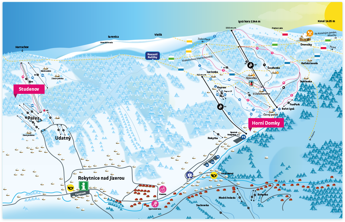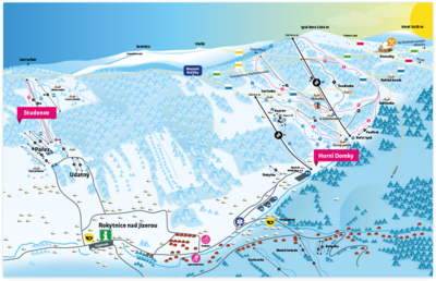 Informacje o ośrodku: Region narciarski Rokytnice nad Jizerou – Karkonosze to niewielki obszar sportów zimowych, znajdujący się na krańcu pasma Karkonoszy, a co za tym idzie najwyższych gór w Republice Czeskiej. Na region składają się cztery malownicze wioski: Dolní Rokytnice , Horní, Hleďsebe oraz Františkov. Rozwój osad sięga już XVI wieku, zapoczątkowany został on wydobyciem surowców miedzi, srebra i ołowiu, a w późniejszym terminie rozwojem przemysłu szklarskiego i turystyki. Dzięki stałym inwestycjom związanym z turystyką goście kurortu mogą liczyć na szeroki zakres zakwaterowania, obejmujący apartamenty, pensjonaty, hotele, schroniska, a także i chałupy. Region składa się z dwóch ośrodków narciarskich: Horní Domky oraz Studenov. Trasy zjazdowe ulokowane są na stokach góry Lysá Hora (Łysa Góra) na wysokościach 620-1315 m n.p.m. Łączna długość wszystkich tras zjazdowych wynosi około 20 km. Trasy zjazdowe są zróżnicowane, więc każdy znajdzie tu coś dla siebie, bez względu na to, jaki poziom umiejętności jazdy na nartach reprezentuje. Pośród tras znajdziemy szerokie nartostrady, sięgające w niektórych odcinkach nawet 100 metrów szerokości, oraz jeden z najdłuższych zjazdów w Karkonoszach, na którym deniwelacja terenu wynosi 600 metrów. Dodatkowo kurort dysponuje jedną czerwoną trasą z homologacją FIS. Za transport gości ośrodka na trasy odpowiadają nowoczesne 4-krzesełkowe wyciągi linowe oraz wyciągi narciarskie typu poma (Pomagalski S.A.). W przeciągu jednej godziny wyciągi są w stanie przetransportować około 10 tysięcy gości ośrodka. Zwolennicy powietrznych akrobacji na nartach i snowboardzie docenią nowoczesny snowpark znajdujący się nieopodal wyciągu narciarskiego na Łysą Górę. Snowpark wyposażony jest w skocznie oraz balustrady. Obiekt wyposażony jest także w wyciąg talerzykowy. W ośrodku znajduje się obszar dziecięcy Milkapark, w którym można odnaleźć ćwiczebną trasę zjazdową dla dzieci, szkółkę narciarską oraz personel zajmujący się opieką nad najmłodszymi gośćmi kurortu. Trasy kurortu wspierane są przez urządzenia zaśnieżające (urządzenia są w stanie wyprodukować śnieg na obszarze 72% tras zjazdowych) oraz nowoczesne ratraki. Osoby lubiące narciarstwo biegowe będą niewątpliwie zadowolone z oferty regionu, dostaną bowiem do dyspozycji aż ponad 50 kilometrów ratrakowanych tras do narciarstwa biegowego. Ośrodek dysponuje całkiem sporym zapleczem serwisowym (skiservis), gdzie można zadbać nie tylko o swój sprzęt narciarski – obsługa serwisów zajmuje się zarówno nartami do zjazdów, jak i biegowymi – ale również wypożyczyć całe osprzętowanie niezbędne do jazdy na nartach lub snowboardzie.W kurortach odnajdziemy cztery parkingi, zarówno bezpłatne, jak i płatne strzeżone. Na niektórych parkingach zatrzymuje się Skibus, który przewozi za darmo gości regionu pomiędzy kurortami, wchodzącymi w jego skład. Region należy do spółki Spartak a.s., która jest częścią Skiregionu CZ, w skład której, oprócz opisywanego Rokytnice nad Jizerou, wchodzą jeszcze takie regiony narciarskie jak: Paseky nad Jizerou, Příchovice, Rejdice, a także Skiareál Harrachov. Z usług apres ski można liczyć na jedną restaurację oraz kilka barów szybkiej obsługi, które znajdują się bezpośrednio na stokach lub w ich okolicy. Ponadto ośrodki dysponują dodatkowym zapleczem rozrywkowym w postaci: hali sportowej, kręgielni, toru do jazdy na gokartach, toru bobslejowego, kortów tenisowych oraz sauny. Miłośnicy zabytków mogą umilić sobie czas, zwiedzając m.in.: