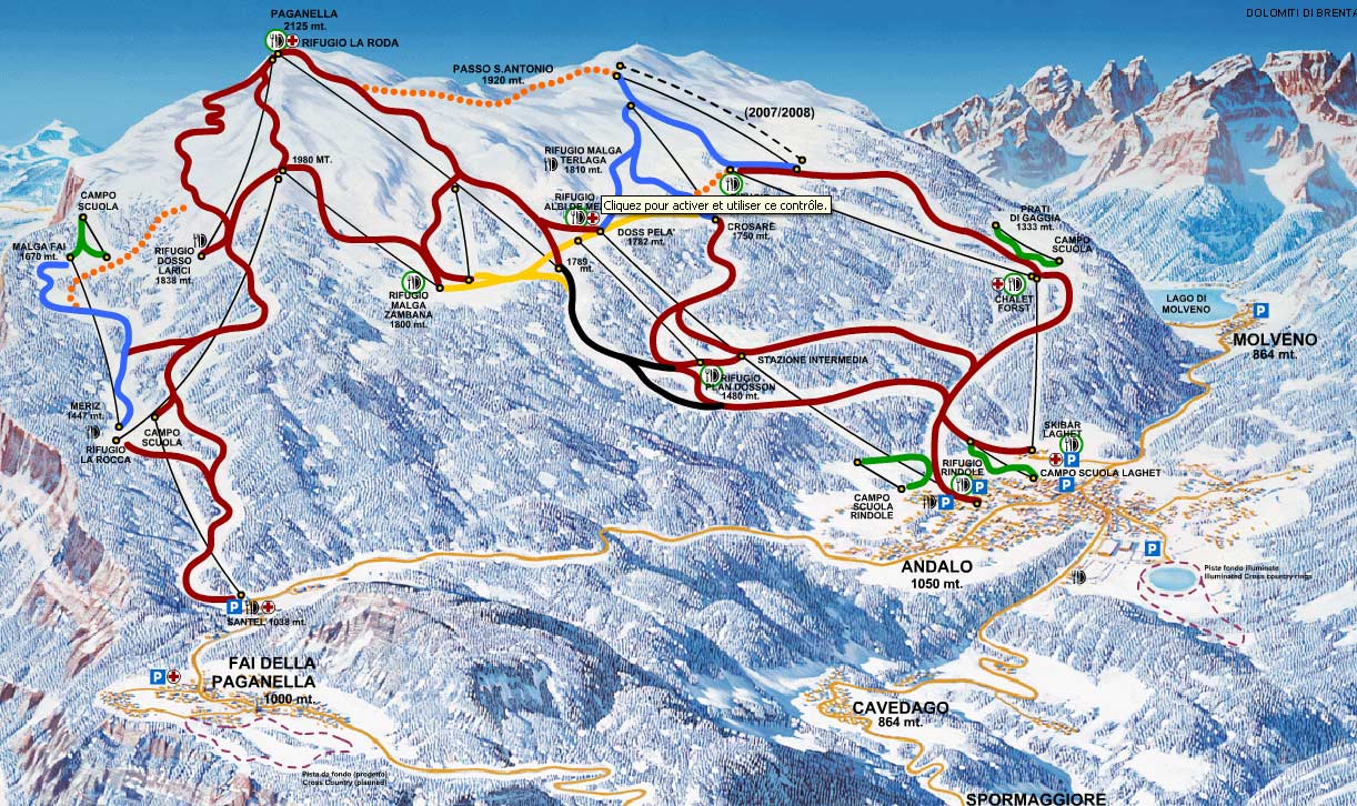 Region narciarski Paganella Brenta Skipass jest również częścią Dolomiti Adamello Brenta Skirama. Amatorzy stylu cross-country będą mogli korzystać ze śniegu w centrum sportowym Andalo, gdzie znajdą specjalnie przygotowane trasy. Jedną o długości 3 km, podświetlaną wieczorem, i drugą na 5 km prowadzącą przez pięknie ośnieżone lasy.