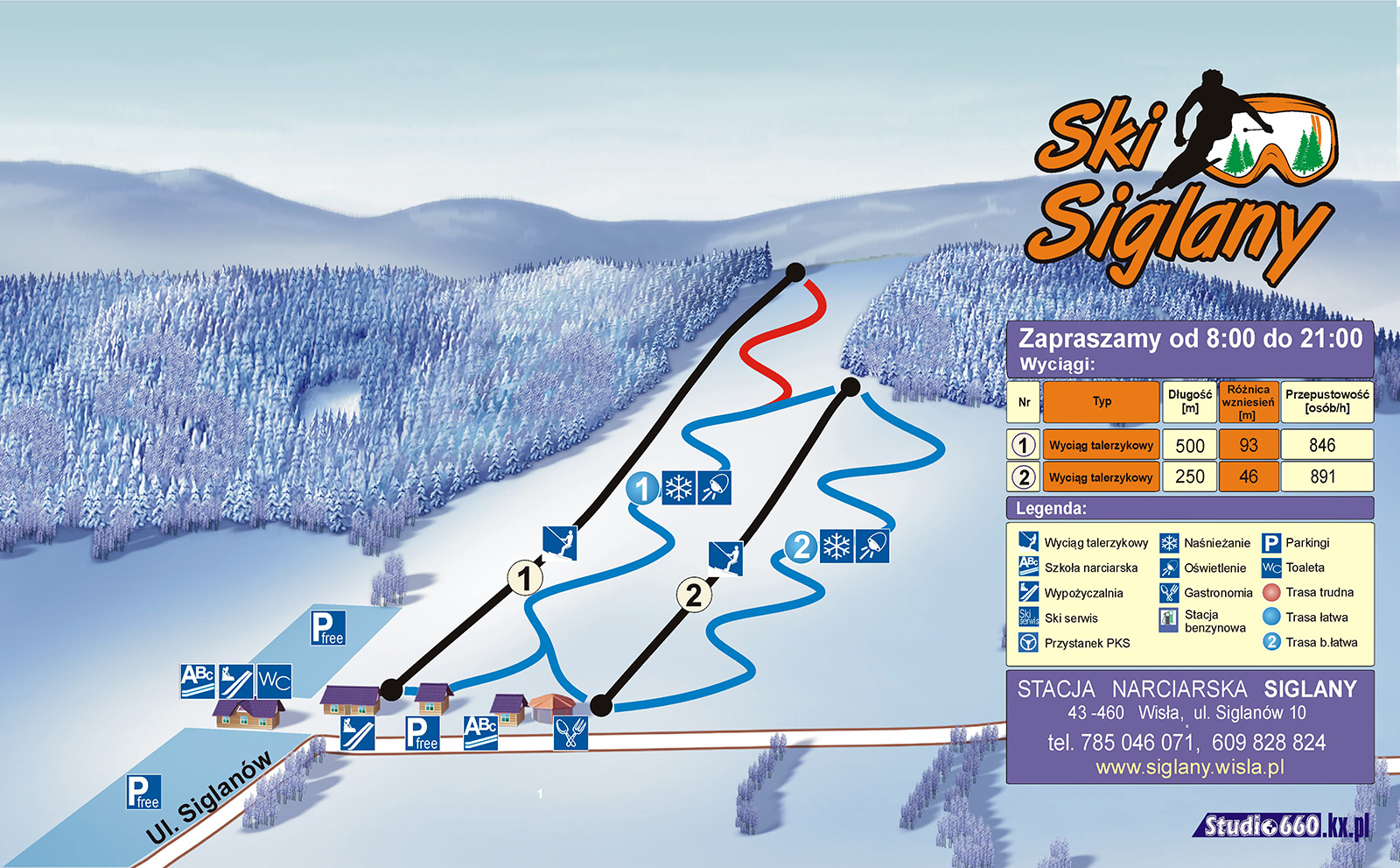 Informacje o ośrodku: Ski Siglany położone w Wiśle-Głębce to niewielki ośrodek narciarski z dwoma wyciągami orczykowymi o przepustowości około 1 600 osób na godzinę. Obie trasy są codziennie ratrakowane, wieczorami oświetlone, a w razie konieczności naśnieżane. Dla początkujących fanów białego szaleństwa ośrodek oferuje usługi profesjonalnej kadry instruktorów, a także dwie bogato wyposażone wypożyczalnie sprzętu zimowego. Ośrodek ma bardzo dogodne położenie, znajduje się około 500 metrów od DW 941 (Wiślanki), dla kierowców Siglany oferują dwa darmowe parkingi. A także, około 500 metrów dalej w kierunku Istebnej położony jest przystanek kolejowy Wisła Kopydło.