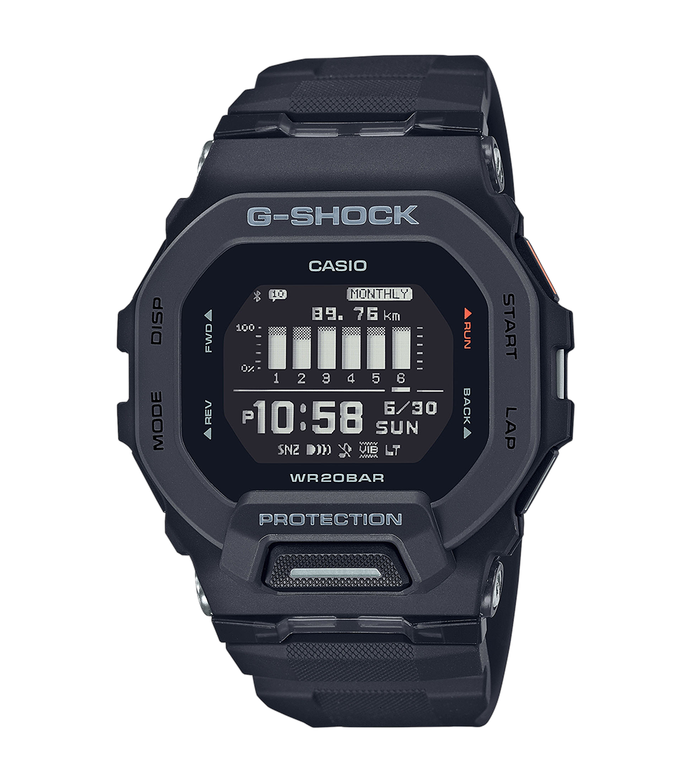 Moduł Bluetooth pozwala na zarządzanie funkcjami zegarka z poziomu telefonu. Dzięki dedykowanej aplikacji G-Move mamy możliwość planowania treningów i analizy postępów sportowych. G-SHOCK GBD 200 posiada funkcje krokomierza, liczy spalone kalorie i prędkość. Bardzo widoczny wyświetlacz pozwala na wygodną analizę parametrów podczas treningu. GBD-200 został wyposażony w stoper, timer, alarm, funkcję drzemki, alarm wibracyjny.