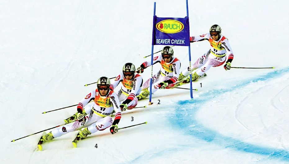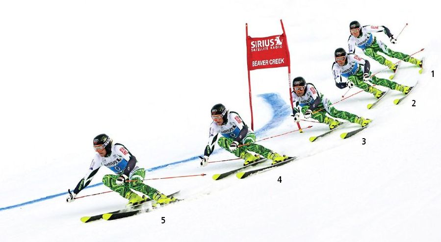 Sterowanie, czyli środkowa część skrętu, to moment wymagający od zawodnika zaangażowania największej siły. Silne nogi oraz mięśnie stabilizujące tułów muszą wykonać pracę i pokonać siłę odśrodkową działającą na zawodnika w skręcie. Tutaj nie ma taryfy ulgowej. Im lepiej jesteś przygotowany fizycznie, tym ciaśniejszym (szybszym) torem możesz pojechać. Wiąże się to oczywiście z większymi przeciążeniami.