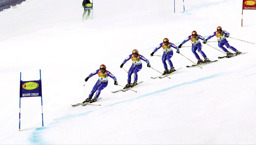 - narciarz dogania narty przed rozpoczęciem kolejnego skrętu,