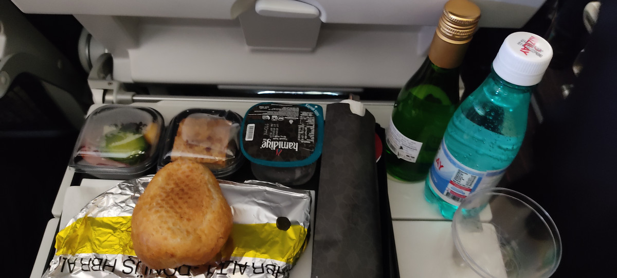 To nie był koniec niespodzianek, na pokładzie serwowano normalny, ciepły posiłek: burek z serem i szpinakiem, ciasto, jogurt miętowy, dżem i źródlaną wodę w kubeczku przypominającym kształtem opakowanie kefiru z późnych lat osiemdziesiątych. Napoje do posiłku jak na pokładzie Lufthansy, piwo, wino białe i czerwone, napoje gazowane, soki, kawa i herbata (będzie o niej nie raz jeszcze).
