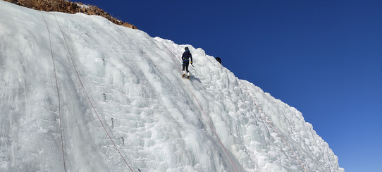 Widoki są takie, że jazdy mamy niewiele, co chwilę foto pauzy, tu zdjęcie, tu video, tu znów fotka. Bez pośpiechu kończymy zjazd rozpoznawczy i wracamy ponownie na niebieską, tym razem w planie jest jazda. Plan prawie się udaje, udałby się, gdyby nie lodowi wspinacze trenujący w pełni słońcu na lodospadzie, takich kadrów nie wolno przegapić.