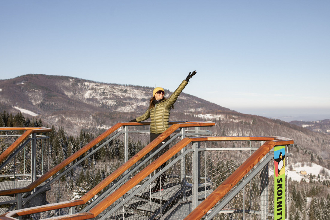 Drewniana Wieża widokowa w samym centrum Wisły, na górnej stacji kolei krzesełkowej Skolnity, już jutro (2 grudnia) zostanie otwarta dla zwiedzających. 38-metrowa drewniana konstrukcja z ponad 700-metrową ścieżką w koronach drzew gwarantuje zapierający dech w piersiach widok na Serce Beskidów, Śląsk Cieszyński, a przy dobrej widoczności na Tatry i aglomerację śląską. Budowlę wyróżniają balkony widokowe w kształcie ogromnych dłoni. To już trzecia taka wieża w ośrodkach Grupy Pingwina.