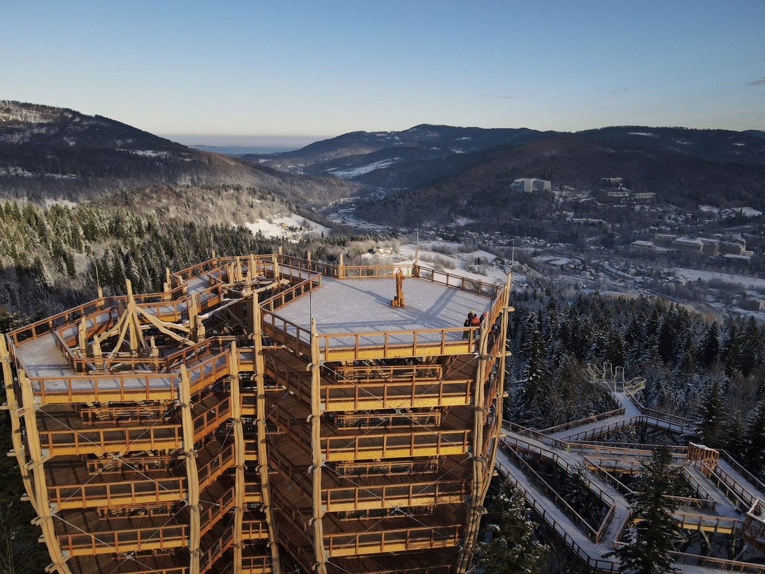 – Ta wieża jest wyjątkowa, bo takich majstersztyków jest w Polsce bardzo mało. Cała konstrukcja jest w pełni wykonana z drewna robinii akacjowej, która była do nas sprowadzana zza granicy. Jest tam wycinana, bo mocno wypiera rodzime gatunki. Drewno cechują duża trwałość i ciekawe kształty, a jego fragmenty były dopasowywane przez budowniczych zupełnie jak puzzle. Z wieży podziwiamy przede wszystkim widoki, ale myślę, że sama konstrukcja zachwyci także wiele osób – mówi Karolina Hanik, koordynatorka marketingu stacji Skolnity w Wiśle, a zarazem dyrektor ds. komunikacji Grupy Pingwina.