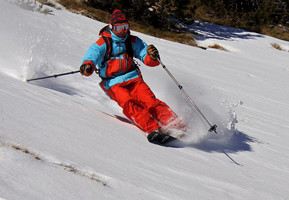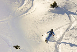 Na okazję wątpliwych warunków poza trasami mam w Andorze kilka sprawdzonych miejscówek, a do najlepszych należy sektor freeride na Pic d'Encampadana (2491 m) w stacji Grandvalira. Atutem jest północno-wschodnia wystawa terenu i w większości trawiaste podłoże, co nawet przy niewielkiej ilości śniegu umożliwia w miare bezstresowe skręcanie. Płaska południowa strona góry skutkuje tym, że śnieg jest zwiewany przez południowe wiatry na północną stronę. Dlatego zjazdy we wklęsłych formacjach Canal de Encampadana i Canal de les Solanelles oferują nawet w grudniu niezły śnieg. Tak było i tym razem: na Encampadana zastaliśmy prawdziwy, choć niezbyt głęboki puszek. Przynajmniej w górnej części, bowiem dolna oferowała kluczenie między krzakami w poszukiwaniu przejazdu po białym. Cały sektor oferuje liczne warianty zjazdów o przewyższeniu 400 m.