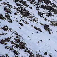Po takim rozjeżdżeniu udaliśmy się na jeden dzień do stacji Vallnord, a konkretnie do najwyżej położonego sektora Arcalis, czyli miejscówki, gdzie wcześniej kilka razy udało mi się polatać śmigłem. Warto wiedzieć, że w zeszłym sezonie teren gościł imprezę Freeride World Tour, czyli jedną z edycji najważniejszej imprezy freeride na świecie. Tej zimy Arcalis również będzie gospodarzem FWT: w terminie 20-26 lutego. Są szanse, że przy tej okazji zorganizujemy z Jędrkiem prawdziwy Freeride Camp. Podczas Polskich Dni zaproponowano nam wyprawę na szczyt górującego nad okolicą Pic d'Arcalis (2776 m), a następnie zjazd Północną Ścianą szczytu. Czekało nas najpierw około półgodzinne podejście z foki na przełęcz Portella del Arcalis, potem dość przyjemna wspinaczkowo grań, z jednym trudniejszym miejscem w zejściu i wreszcie zjazd Canal Sergi, mniej więcej lewą częścią ściany. W górnej części zjazdu, na relatywnie szerokich, choć stromych polach śnieżnych, czekał nas całkiem niezły powder. Właściwy kuluar okazał się wąską i niemal pionową nitką śniegu wciśniętą między wysokimi skałami, ze zdradliwymi kamienieniami pośrodku, tylko nieznacznie przykrytymi śniegiem. Odcinek ten liczył jakieś 150 metrów i należało w nim wykazać się szczególną uwagą, tym bardziej, że płynne skręcanie było niemal wykluczone. Skończyło się bez strat, jeśli nie liczyć pękniętej narty Jędrka na skutek uderzenia w kamień. Jędrek jak to Jędrek: nie przejął się zbytnio tym faktem i spokojnie zjechał na dół. Łącznie Canal Sergi oferuje około 450 m przewyższenia czyli vertical drop (vd).