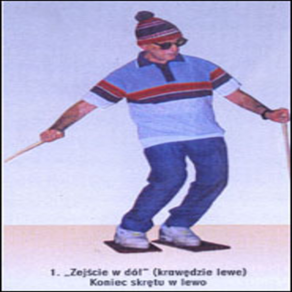 <font color="#ff0000"><b>Ćwiczenie 4 (rys. 2)</b></font>: Powtórzmy wielokrotnie ćwiczenie 3, ale ze specjalnie przygotowanymi prętami, które zastąpią nam kijki narciarskie. "Schodząc w dół" przechylamy stopy, pozorując ustawienie narty na krawędziach. Omówione ćwiczenia przyzwyczają nas do aktywnej pracy kolan, do właściwej synchronizacji pracy rąk i nóg i ułatwią nam później na stoku wykonywanie skrętów na nartach. Pamiętajmy jednak, że po każdym skręcie nieznacznie unosimy i cofamy tułów w ruchu rozmachowym, po czym następuje zamach, tj. "zejście w dół" - podobnie jak przy ruchu ręki rzucającej kamień (rozmach i zamach). Zamachowy ruch przy "zejściu w dół" przypomina trochę ruch kosiarza. Podaną koncepcję gimnastyki narciarskiej proszę traktować jako propozycję. Sądzę, że może być pożyteczna i że warto ją stosować. W ten sposób rozpoczniemy nasz sezon narciarski już w pewnym stopniu przygotowani. Jakkolwiek opisane ruchy są zdecydowane, to na nartach wykonywać je będziemy bez przesady, tj. raczej miękko i płynnie. Działające bowiem w trakcie rozwijania się skrętu siły, w tym siły bezwładności, a zwłaszcza siła odśrodkowa, pozwolą na stosowanie tych ruchów w sposób bardziej oszczędny.
