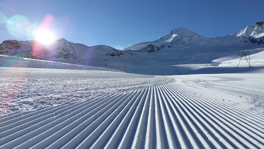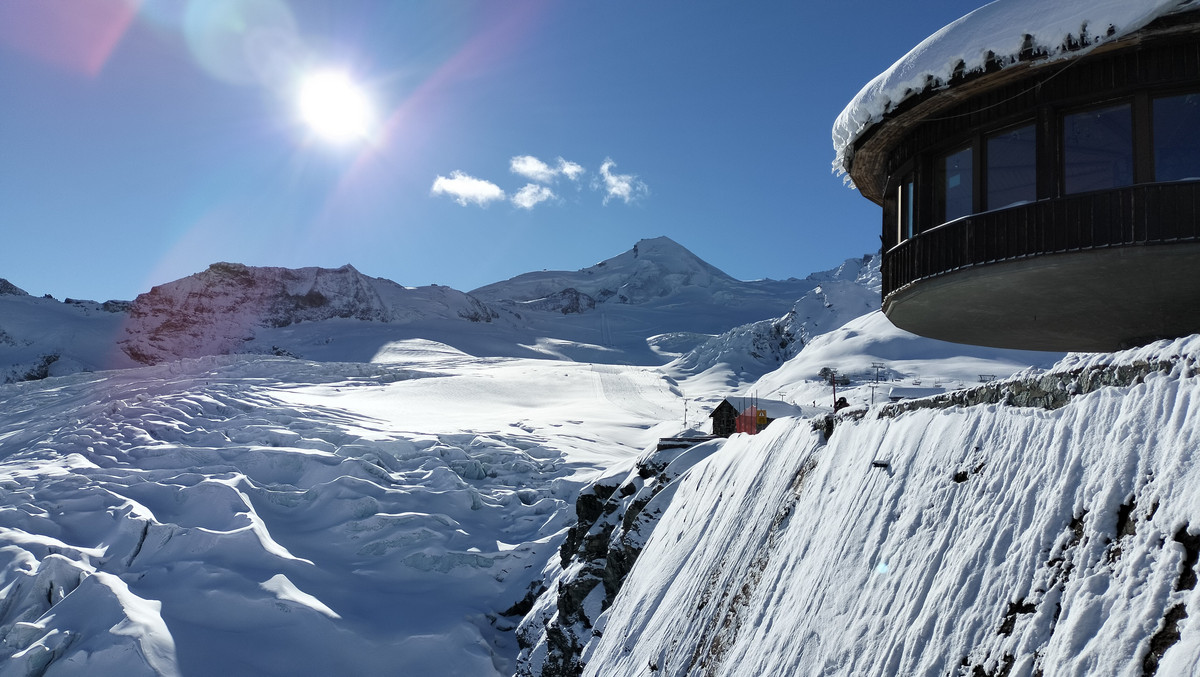 Na zrobienie sobie selfie przy ogromnym, wbitym w śnieg napisie każdy dojedzie bezpiecznie. Od obrotowej restauracji aż do Langfluh nartostrady na lodowcu Fee są bajecznie szerokie a po kilku stromszych odcinkach wypłaszczają się wzdłuż imponującego jęzora przypominającego ślad gąsienic po gigantycznym traktorze. A przy górnej stacji zabytkowej kolejki Langluh, widoki zarówno na czterotysięczniki, od Monte Rosy (4634 m npm) po Dom (4545 m npm) jak i leżącą 1000 metrów niżej wioskę są obłędne.