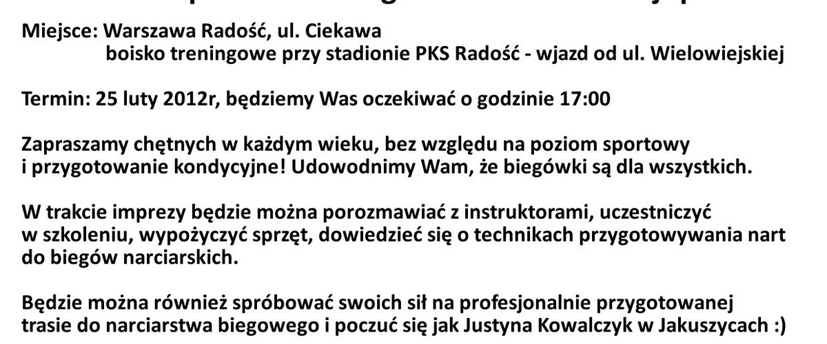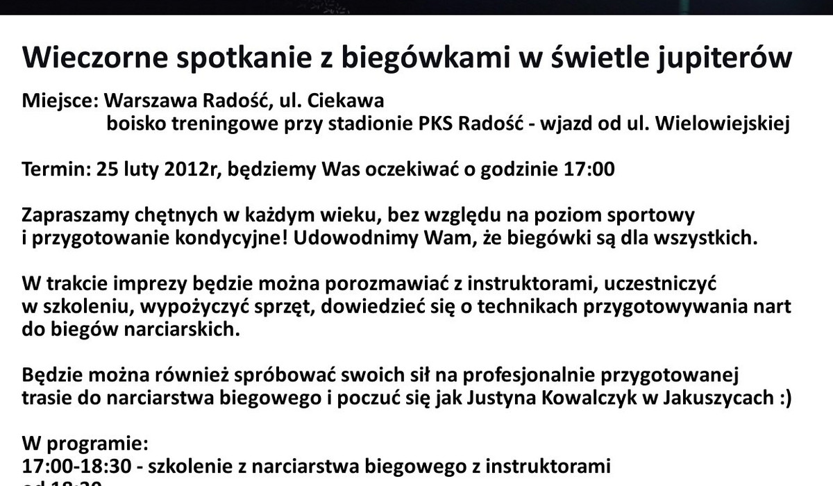 Wszystko wskazuje na to, że to już ostatnia okazja, by w tym sezonie pobiegać na nartach w Warszawie. Tym goręcej zapraszam w imieniu Towarzystwa Narciarskiego "Biegówki" w najbliższą sobotę, 25 lutego, na Wieczorne biegówki w Radości.