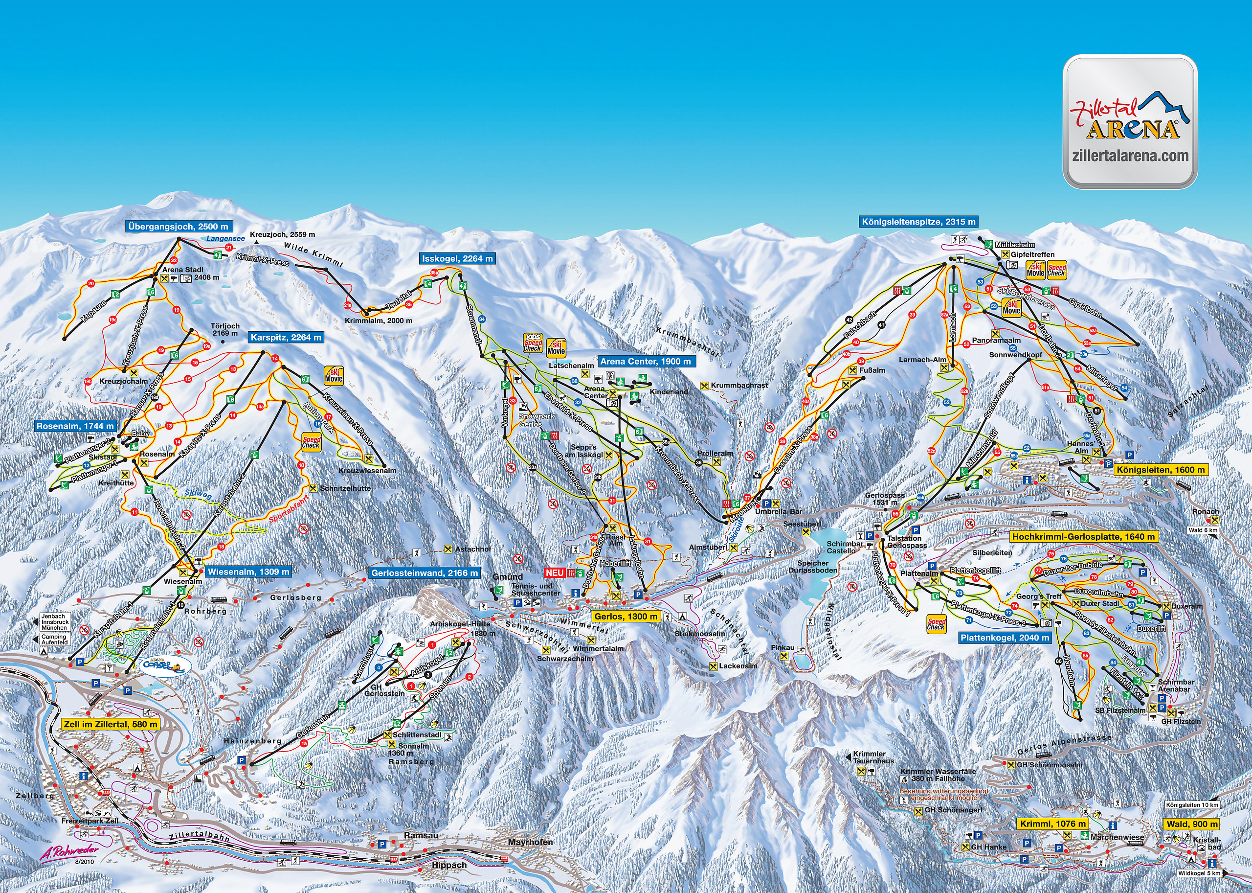 Informacje o ośrodku: Leżący 60 km na wschód od Innsbrucku ośrodek narciarski Gerlos-Zillertal Arena to miejsce, które powinno zaspokoić niejednego pasjonata jazdy na nartach. Nazwa ośrodka została zaczerpnięta z dwóch ważnych dla kurortu obiektów, pierwszym z nich jest miasteczko Gerlos, drugim z kolei jest dolina Zillertal, w której sercu znajduje się miasteczko.Stoki narciarskie Gerlos-Zillertal Arena rozłożone są na wysokościach 1300-2500 m n.p.m, dzięki czemu sezon narciarski zaczyna się tutaj już na początku grudnia a kończy dopiero w ostatnich dniach kwietnia. Swoim gościom ośrodek ma do zaoferowania 166 km tras narciarskich (43 km tras niebieskich, 89 km tras czerwonych, 11 km tras czarnych). Także jak łatwo zauważyć, miejsce to nadaje się głównie dla ludzi trochę z nartami obytych. Nie oznacza to jednak, że dopiero co zaczynający narciarze nie mają tutaj czego szukać. Bowiem odnajdą oni tutaj sporo łatwych tras, chociażby zjazdy na Arabiskogel i Lärchkopf, z którymi nie powinni mieć większych problemów.Ośrodek dysponuje 51 wyciągami narciarskimi: W Arenie znajdują się 3 główne miejscowości, posiadające bezpośredni dostęp do stoków. Pierwszą z nich jest wymienione już wcześniej Gerlos, pozostałe dwie, to: Zell am Ziller oraz Königsleiten.Obszar Gerlos przez wielu uważany jest za prawdziwy raj dla snowboardzistów. Ośrodek otrzymał także tyrolski snowboardowy znak jakości, co dało mu miejsce w czołowej piątce najlepszych ośrodków w Austrii. Snowboardziści odnajdą tutaj sporą liczbę obiektów, które na pewno umilą im czas. W ośrodku znajduje się kilka halfparków, między innymi w takich regionach jak: